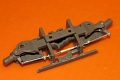 Die Idee eines Out-Of-The-Box Baues war ziemlich schnell ad acta gelegt. Was mich an dem Bausatz am meisten stört, ist die fehlende Lenkbarkeit der vorderen und hinteren Räder, DIE Besonderheit beim Gama Goat, neben dem Knickgelenk natürlich, das wiederum hat Tamiya als voll beweglich vorgesehen! Inspiriert durch einen Baubericht auf Youtube und in einem Forum machte ich mich ans Werk. Da mir die gesehene Umsetzung nicht so 100% zusagte, habe ich die Sache noch etwas verfeinert. Unter Zuhilfenahme von Messingröhrchen, Stecknadelköpfen und Spritzenkanülen habe ich die Lenkung "gangbar" gemacht. Die Gelenkköpfe entstanden aus zu Ösen gebogenem Draht, der in ein Rohr eingesetzt wurde, bis sie in etwa wie eine Spurstange aussahen. Da die Gelenkstange dreigeteilt ist, war die Bestimmung der exakten Länge etwas knifflig (man kann eben nicht flugs mal noch ein wenig kürzen). Ich habe das Probelm dadurch gelöst, dass die kurzen Stangen, die aus dem Rahmen herausschauen, in der Achsenmitte in einem weiteren Rohr geführt werden. In diesem Rohr sind beide Stangen (die beide absichtlich zu kurz sind) zunächst noch verschiebbar. Erst beim trockenen Zusammenbau konnte die richtige Stellung des zentralen Rohres festgelegt und die beiden Stangen darin fixiert werden. "Meine" Lenkung besteht also aus jeweils fünf beweglichen Teilen.